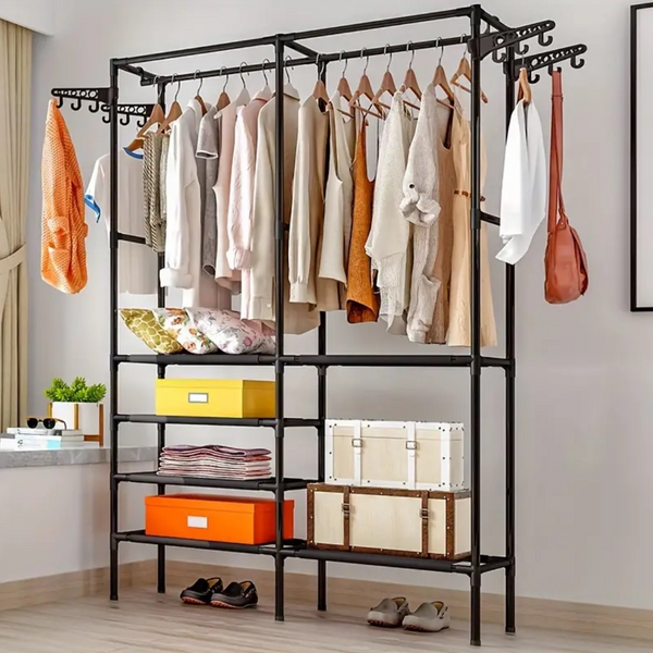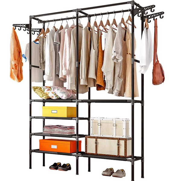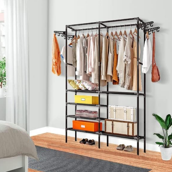 Deci, daca iti doresti sa-ti mentii hainele si accesoriile organizate si la indemana, un suport organizator de imbracaminte si incaltaminte cu agatatori laterale pentru palarii, esarfe sau posete este alegerea perfecta pentru tine!