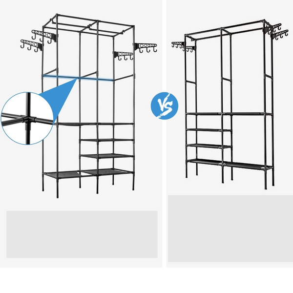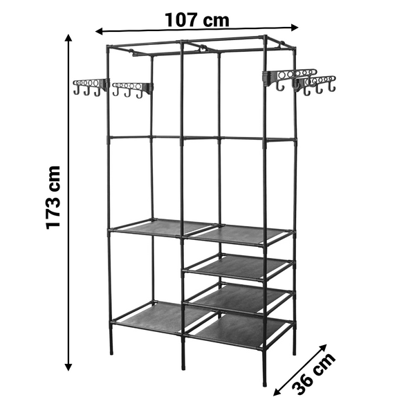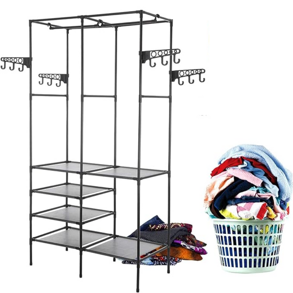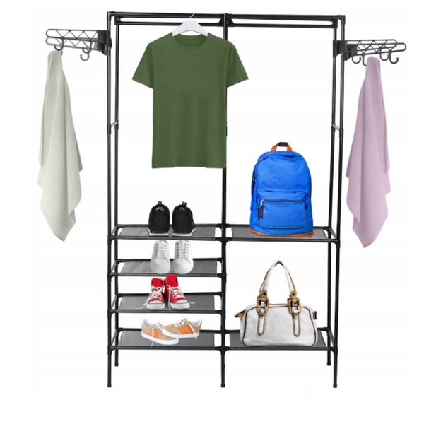 In plus, suportul organizator de imbracaminte si incaltaminte cu agatatori laterale este fabricat din materiale rezistente, asigurand durabilitate si stabilitate. Astfel, vei putea sa-ti bucuri de acesta investitie pentru o perioada indelungata de timp.