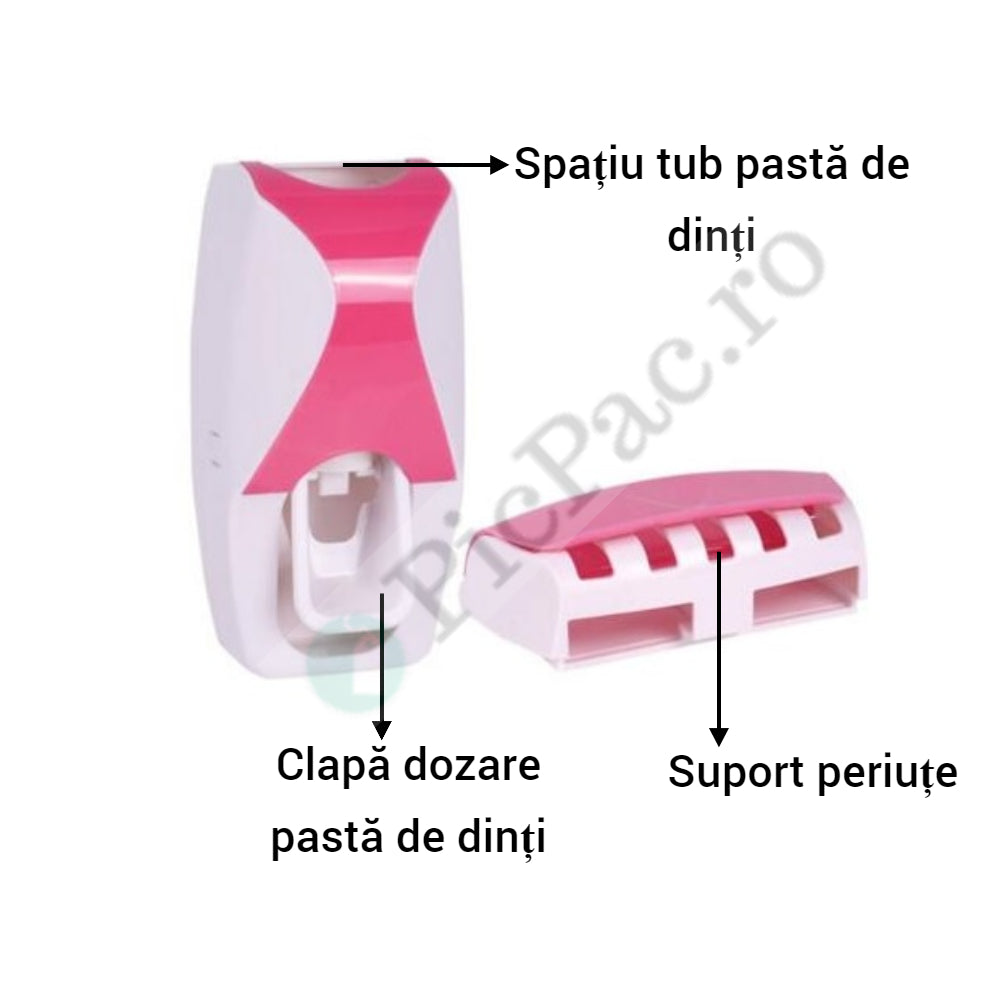 Beneficii - Dispozitiv util si comod - Compatibil cu toate tuburile clasice de pasta de dinti - Ideal pentru a pastra baia curata si ordonata - Dozatorul este usor de instalat - Usor de folosit, mai ales de copii si de persoanele in varsta - Faci economie de bani, deoarece extrage si ultima picatura de pasta de dinti din tub - Poate sustine 5 periute deodata
