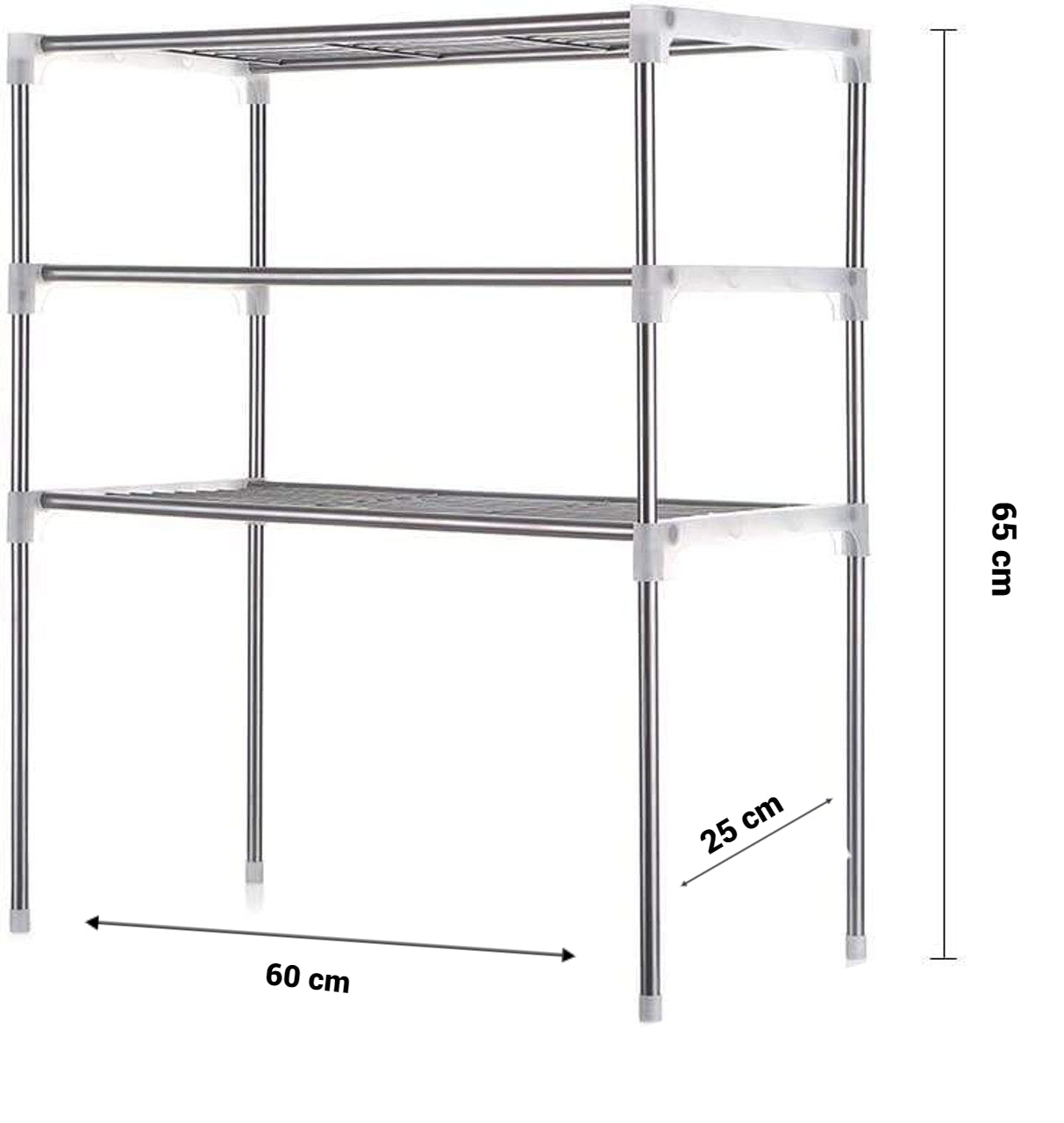 Stabil si rezistent: Facut din bare otel inoxidabil si accesorii de conectare din plastic, este un element de mare ajutor in casa dumneavoastra. Cele doua rafturi sunt realizate tot din bare puse la distanta mica una langa cealalta, permitand circulatia aerului si evita depunerea prafului.