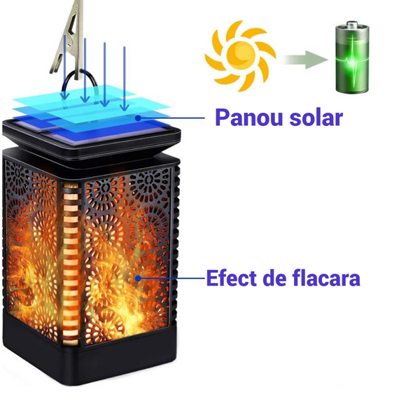 Aceasta lampa este ideala pentru iluminatul curtilor. Pe langa faptul ca va va lumina gradina si va face ca aceasta sa para mult mai primitoare, lampa are si un design cu efect de flacara ce va oferi un aspect unic spatiului in care este amplasata.