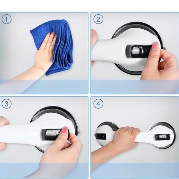 - Manerul este usor de fixat pe perete, gresie sau faianta, avand doua ventuze puternice si un sistem suplimentar de blocare, pentru a sustine greutatea corpului.